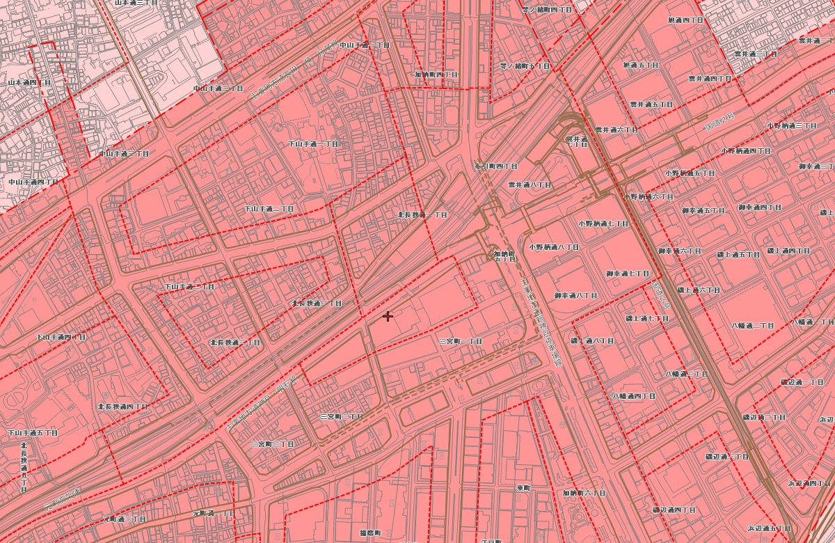 三ノ宮駅の周辺、駅から市役所など海側の部分はほぼすべて防火地域ですね。