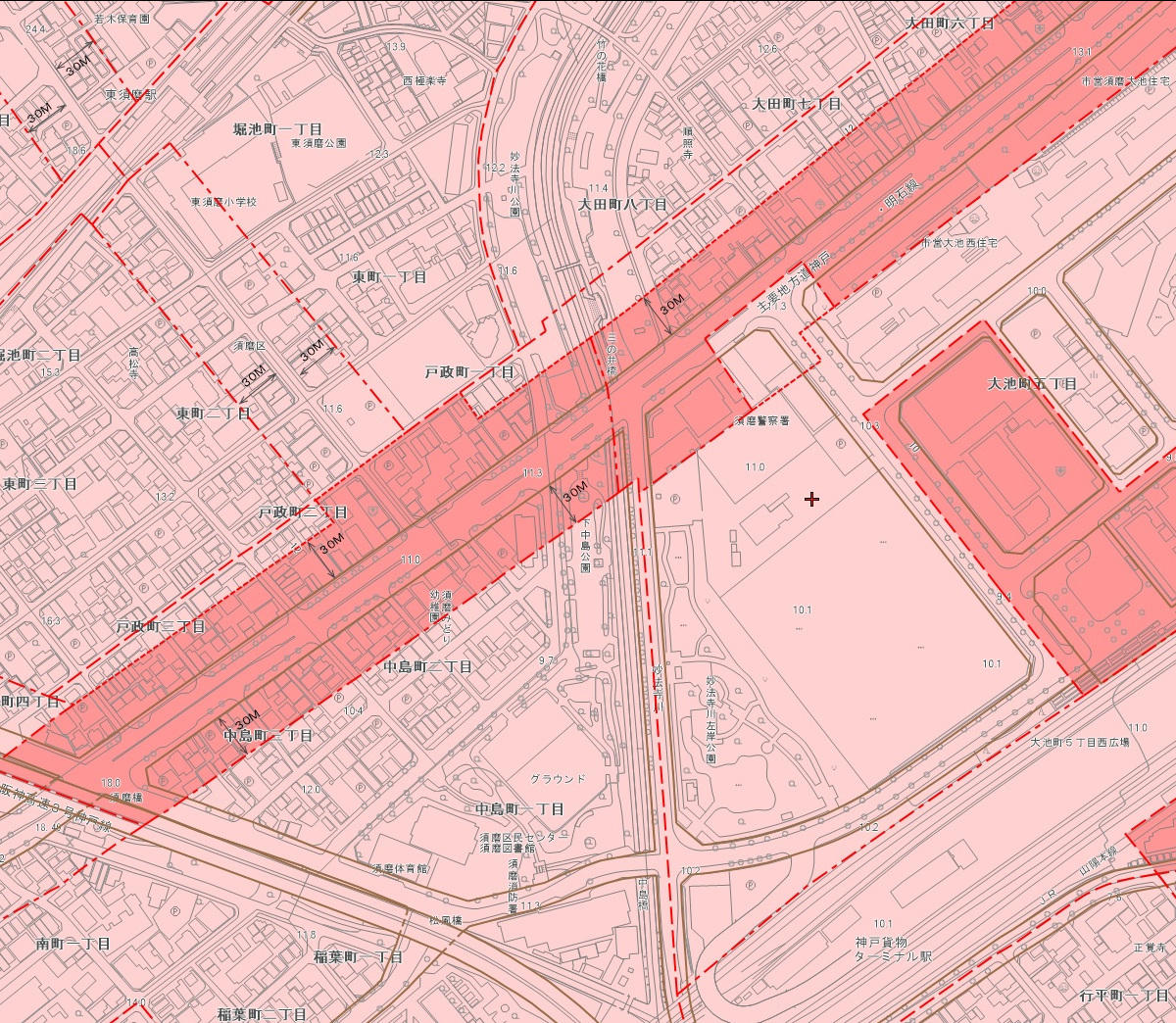 次に、少し離れて神戸市の須磨区、東須磨駅近くの防火地域です。
