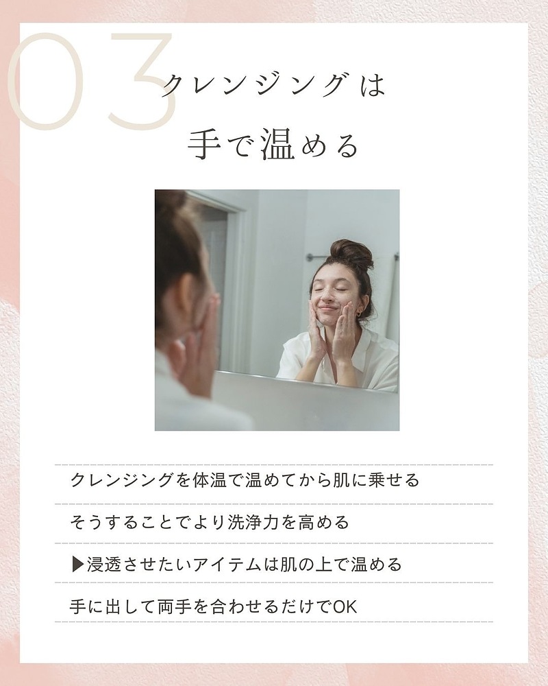 実はクレンジングは温めると、肌の上で緩やかに伸びて、汚れと馴染みやすくなります。