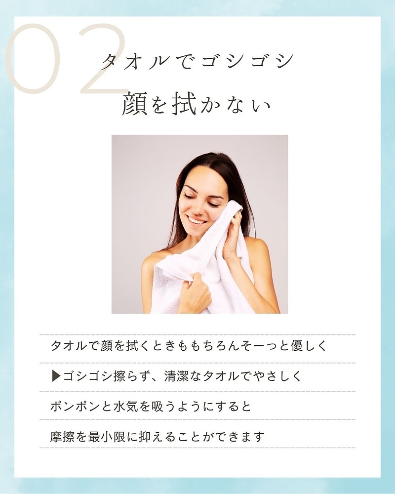 洗顔後にタオルで顔を拭く時、ついやってしまいがちなゴシゴシ強く拭き取ること。