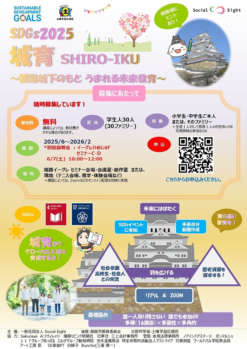 「姫路城をヒントに⽣まれたグローカル⼈材育成のための教育」として、「SDGsの学び・ロボット農育・水光栽培・地域探求・VR体験・スーパーのSDGs・3DCG体験・英語・テニス・バスケットボール・獣医体験・地場産業めぐり・新聞づくり」等の16講座、2023年度・2024年度も含めて講座をチェックしてみましょう!