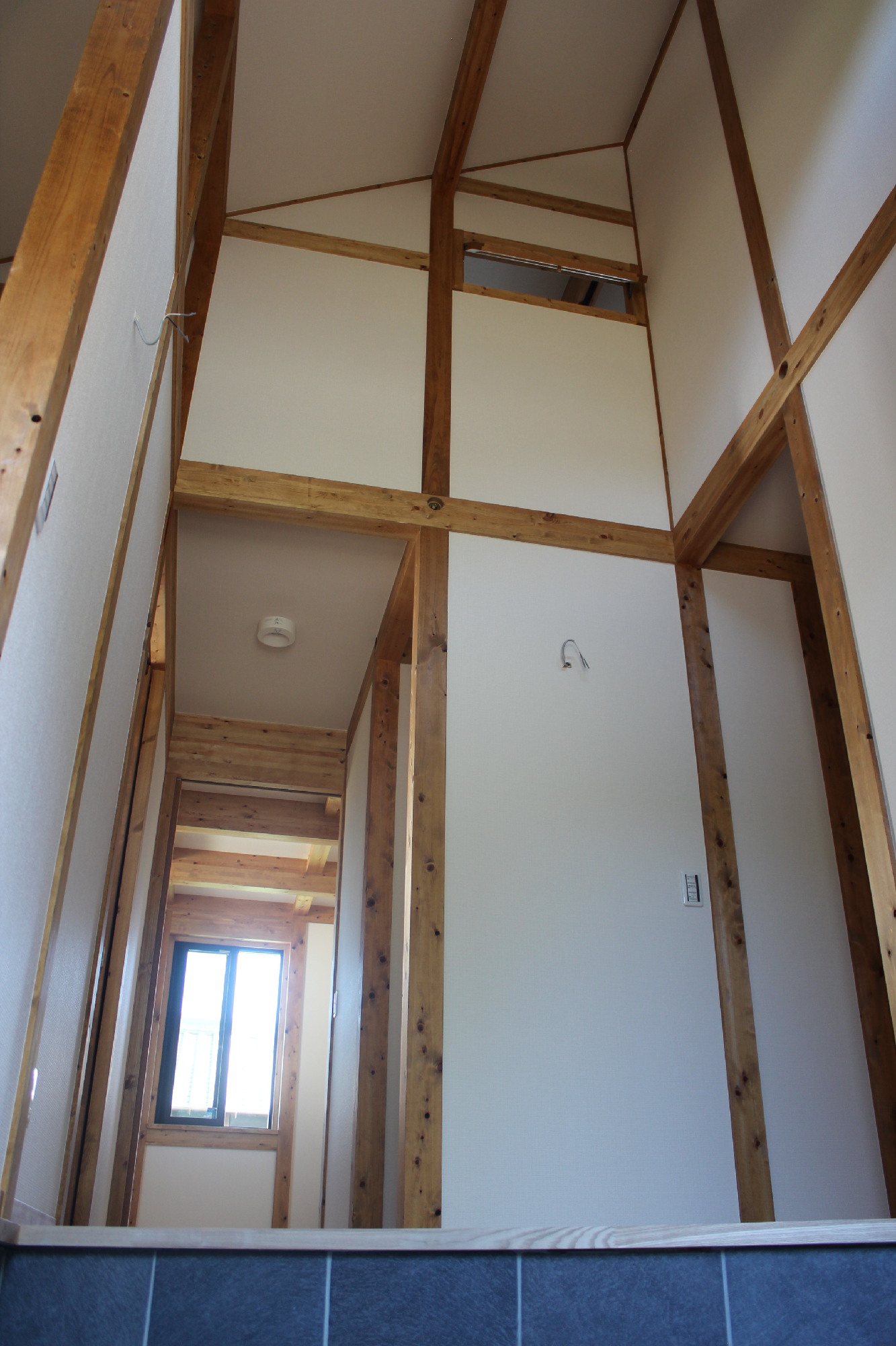 玄関の天井は屋根までつながる吹抜け。