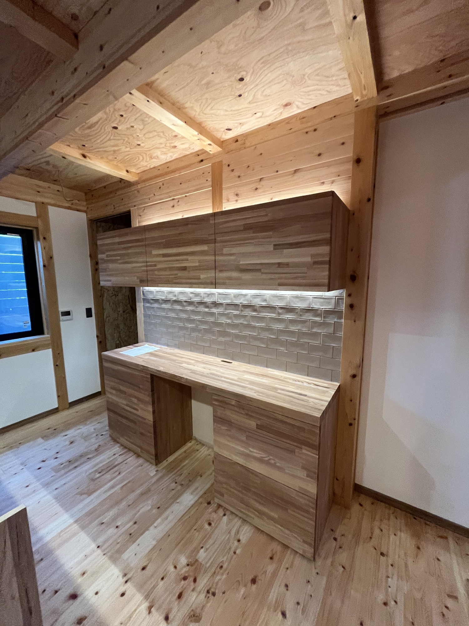 食器棚はタモ材で造作しました。50㎜厚の重厚な仕上がりです。