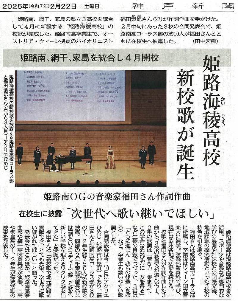 姫路南、網干、家島の県立3高校を統合して4月に新設する「姫路海稜高校」の校歌が完成した。 姫路南高卒業生で、オーストリア・ウィーン拠点のバイオリニスト福田紫妃さん(27)が作詞作曲を手がけた。