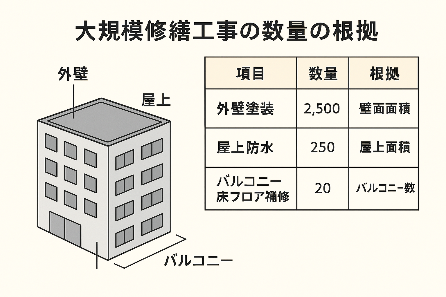大規模修繕工事の見積もり項目は、工種ごとに細かく分類され、数量は建物の規模や劣化状況に応じて算出されます。仕様書と積算根拠が重要です。
