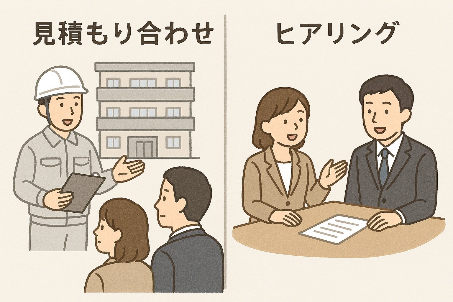 大規模修繕工事では「見積もり合わせ」と「ヒアリング」が施工会社選定の核心プロセスです。見積もりは仕様を統一して公平に比較し、ヒアリングでは書面では分からない施工体制や対応力を確認することが重要です。