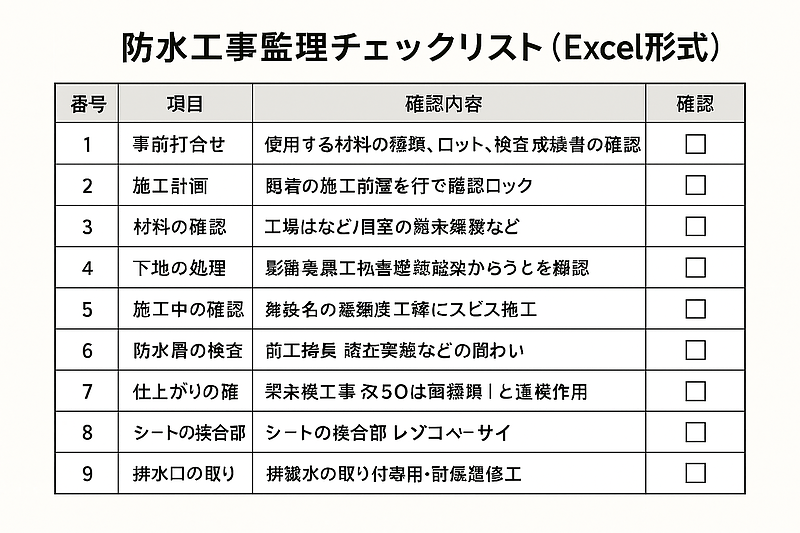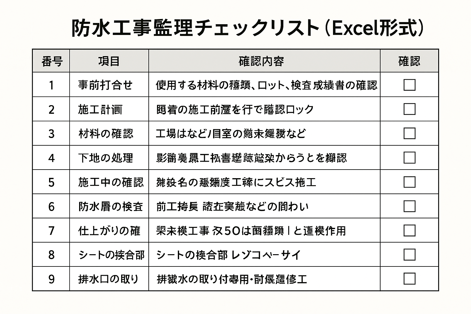 防水工事監理は、漏水リスクを防ぐために 材料・下地・施工精度・安全管理 を徹底確認し、記録と報告を透明に行うことが核心です。「視覚的にわかりやすい報告スタイル」を組み合わせれば、理事会や居住者に安心感を与える監理業務が実現できます。