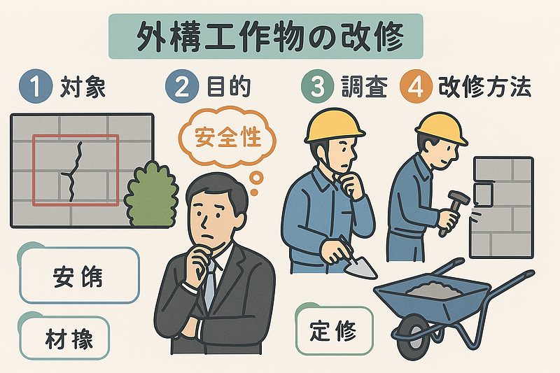 外構工作物の改修といっても、対象や目的によって必要な手順や注意点が大きく変わります。理事会向けに説明する際や、住民合意形成のための資料づくりに役立つよう、外構改修の全体像を“非専門家にも伝わる構造”で整理してみます。