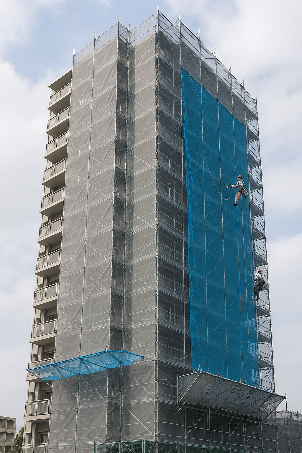 高層マンションの大規模修繕工事では、風・飛散・落下防止対策が安全管理の核心になります。特に高層階では風速が地上の1.5〜2倍になることもあり、通常の低層建物とはリスクの質がまったく違います。