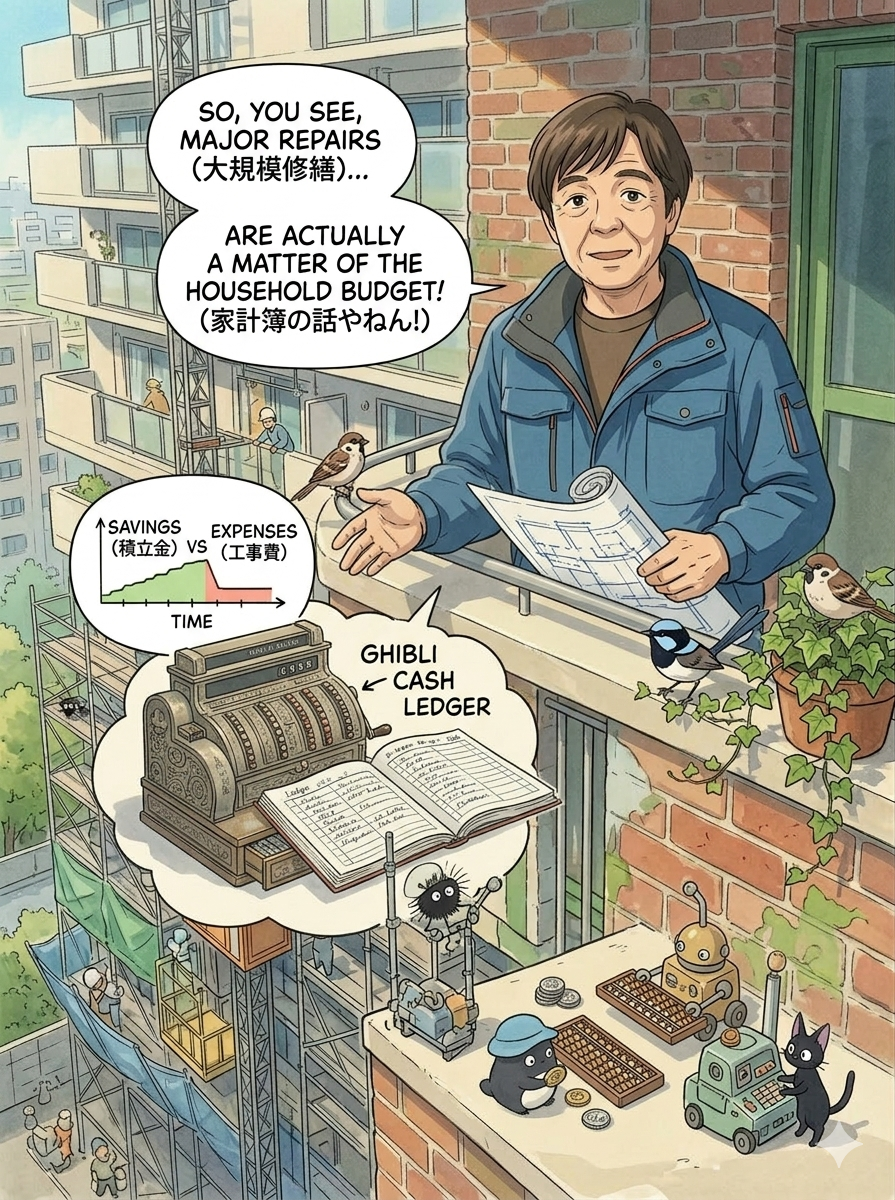 大規模修繕って聞くと「工事」の話に見えるんですけど、ほんまは **“将来の家計簿(長期修繕計画)”**の話なんです。
