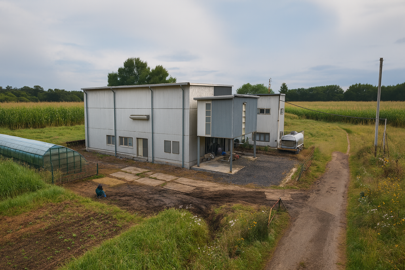 現場には、精米機械を備えた母屋施設と、もみ殻を貯蔵する大型の鋼製タンクが設置されており、いずれも恒久的に利用されていました。