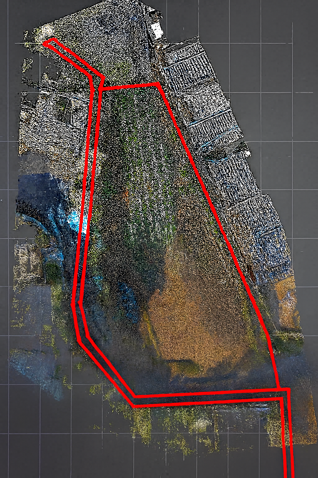 境界線を赤く描いた画像は、衛星写真ではありません。LiDAR SLAM(Simultaneous Localization and Mapping)によって取得した高密度な点群データをもとに生成した、現地の空間を忠実に再現した3D記録です。しかし、この技術の真価は、単に3Dで記録することではありません。