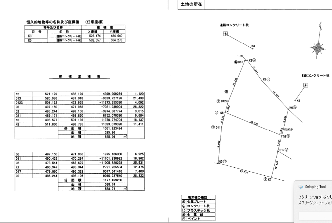 2枚目も現地復元性ありという理解ですが、あくまでも任意座標を基準としていますので、例えば北は8度21分22秒程度ズレていました。これは現地で磁北と言って概ねの北を見るところからスタートしていますので、座標の北を示していません。また引照点も本来の精度の高い復元に利用できるかどうかは不明です。