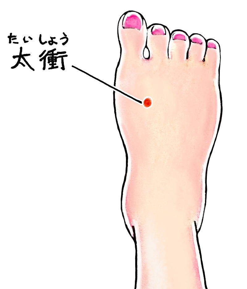 太衝(たいしょう):足の甲、親指と人差し指の間のくぼみ。自律神経を整え、気分を安定させます。