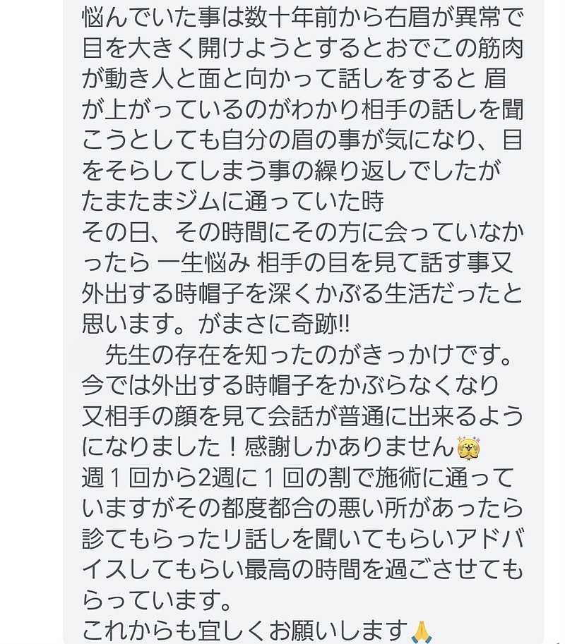 悩んでいたことは数十年前から右眉が以上で、目を大きく開けようとするとおでこの筋肉が動き、人と面と向かって話をすると眉が上がっているのがわかり、相手の話を聞こうとしても自分の眉のことが気になり、目をそらしてしまう事の繰り返しでした。 たまたまジムに通っていたその時その日にその方(鍼灸を紹介してくれた女性)に会っていなかったら一生悩み、相手の目を見て話す事ができず、また外出するとき帽子を深くかぶる生活だったと思います。 が、まさに奇跡!! 先生の存在を知ったのがきっかけです。 今では外出するとき帽子をかぶらなくなり、また、相手の顔を見て会話が普通にできるようになりました!感謝しかありません。 よくなったので週1回の施術から2週に1回の割で施術に通っていますが、その都度つごうの悪いところがあったらみてもらったり話を聞いてもらいアドバイスしてもらい最高の時間を過ごさせてもらっています。これからもよろしくお願いします。(以上、いただいた感想文を捕捉しました)