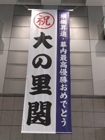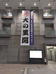 石川県庁内にある「横綱・大の里」の垂れ幕、その大きさには驚くばかり。