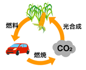 トウモロコシやサトウキビ等で作られるバイオ燃料は、燃焼時CO2を発生するが、他方