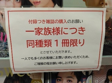 街の書店で見かけた購入数限定の張り紙。どうも、付録付きの雑誌はいま人気のようである。一時期の、お米だけでないようである。