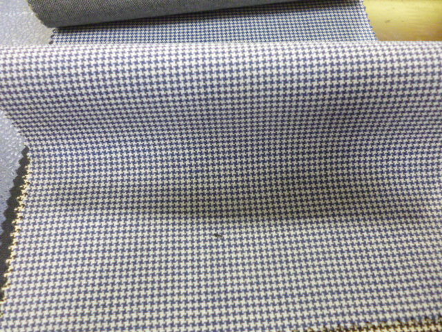 色味は、控えめで洗練されたブルーグレーの千鳥格子柄。遠目には無地のように見える落ち着いた印象でありながら、近づくとさりげないセンスが光ります。ジャケットスタイルにも、セットアップにも映える、絶妙なデザインです。