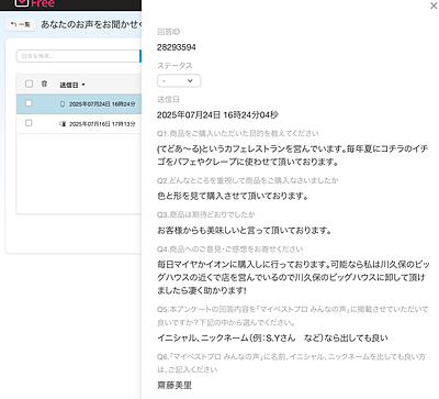 「お客様の声」には、実際にサービスを利用した方からのアンケート回答をそのまま掲載いたします。お客様から頂いていない声や、自作自演した声など虚位の投稿は行わないようアンケートアプリの画像を併せて投稿いたします。これからサービスを利用する方の参考になるよう実績や信頼性を重視してお届けいたします。