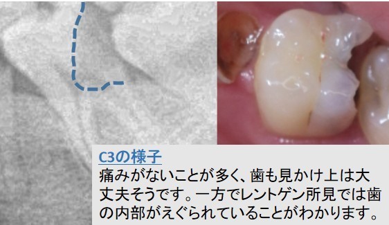 C3(歯髄におよぶう蝕)の場合、来院時にはすでに痛みや苦痛が消えているケースがほとんどです。本来、神経に達するほど進行しているため痛みがあったはずですが、一時的に痛みが治まることがあります。