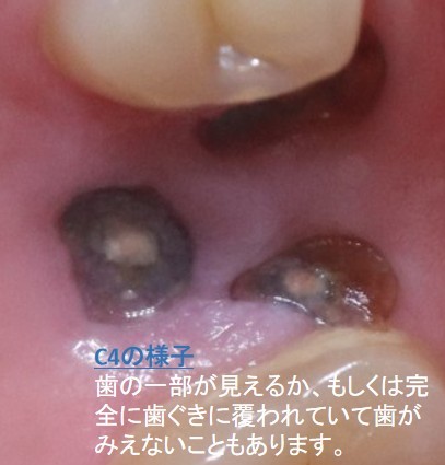 ただし、C4の抜歯では注意が必要です。歯の残された部分が細菌感染を起こし、周囲の骨や粘膜に炎症が波及している場合があります。その場合、抜歯後に見た目以上に大きな穴が空くことがあり、傷口の治癒に相当の時間がかかることをご承知おきください。