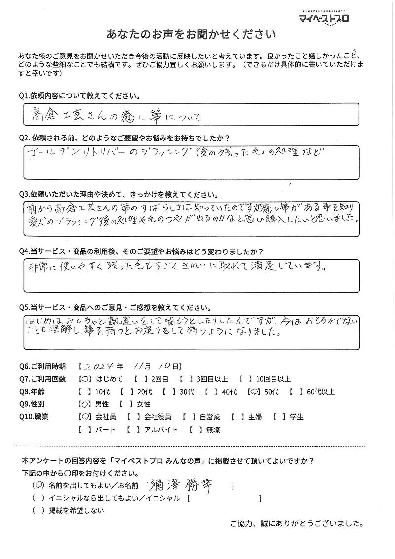 Q1. 依頼内容について教えてください。A1. 高倉工芸さんの癒し箒についてQ2. 依頼される前、どのようなご要望やお悩みをお持ちでしたか? A2. ゴールデンリトリバーのブラッシング後の残った毛の処理などQ3. 依頼いただいた理由や決めて、きっかけを教えてください。A3. 前から高倉工芸さんの箒の素晴らしさは知っていたのですが、癒し箒があることを知り、愛犬のブラッシング後の処理や毛の艶がでるのかなと思い購入してみようと思いました。Q4. 当サービス・商品を利用後、そのご要望やお悩みはどう変わりましたか?A4. 非常に使いやすく残った毛もすごく綺麗に取れて満足しています。Q5. 当サービス・商品へのご意見・ご感想を教えてください。A5. はじめはおもちゃと勘違いをして噛もうとしたりしたんですが、今はおもちゃでないことも理解し、癒し箒を持つとお座りをして待つようになりました。