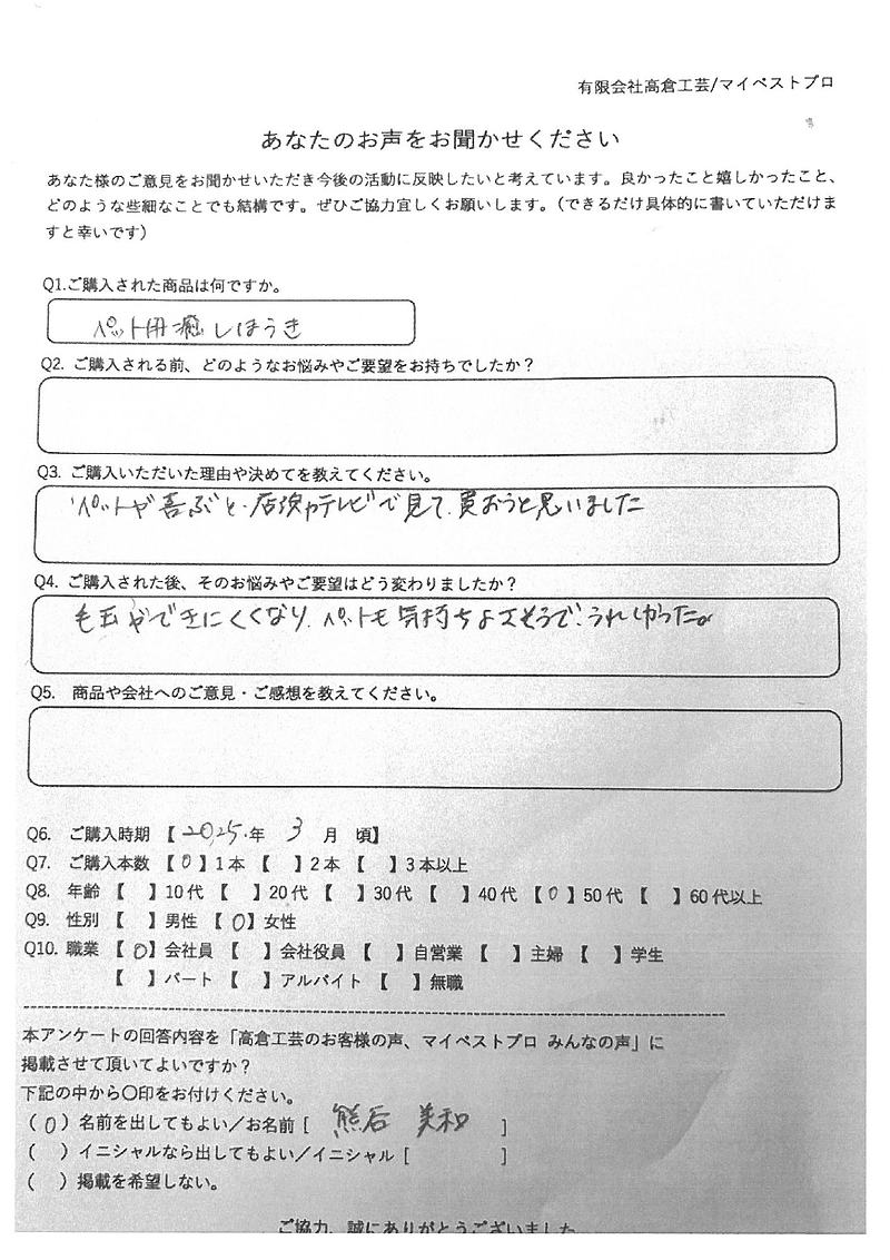 Q1.ご購入された商品は何ですか。A1.ペット用癒しほうきQ2.ご購入される前、どのようなお悩みやご要望をお持ちでしたか? A2. Q3.ご購入いただいた理由や決めてを教えてください。A3.ペットが喜ぶと、店頭やテレビで見て、買おうと思いました Q4.ご購入された後、そのお悩みやご要望はどう変わりましたか?A4.毛玉ができにくくなり、ペットも気持ちよさそうで、うれしかった。Q5.商品や会社へのご意見・ご感想を教えてください。A5.