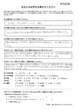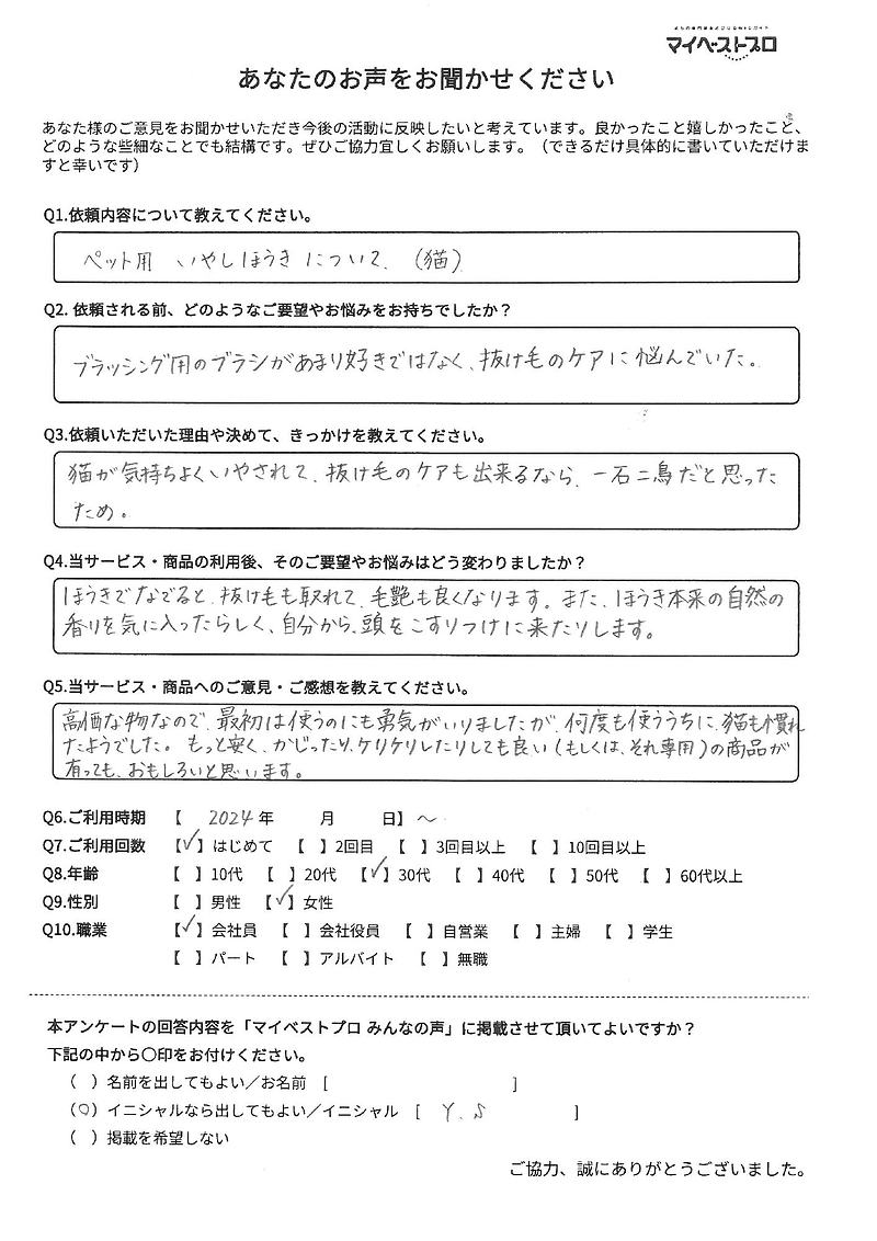 Q1.ご購入された商品は何ですか。A1.ペットいやしほうきについて(猫)Q2.ご購入される前、どのようなお悩みやご要望をお持ちでしたか? A2.ブラッシング用のブラシがあまり好きではなく、抜け毛のケアに悩んでいた。Q3.ご購入いただいた理由や決めてを教えてください。A3.猫が気持ちよくいやされて、抜け毛もケアできるなら一石二鳥だと思ったため。Q4.ご購入された後、そのお悩みやご要望はどう変わりましたか?A4.ほうきでなでると抜け毛も取れて、毛艶も良くなります。また、ほうき本来の自然の香りを気に入ったらしく自分から頭をこすりつけに来たりします。Q5.商品や会社へのご意見・ご感想を教えてください。A5.効果なものなので最初は使うのにも勇気がいりましたが、何度も使ううちに猫も慣れたようでした。もっと安くかじったり、ケリケリしたりしても良い(もしくはそれ専用)の商品が有ってもおもしろいと思います。