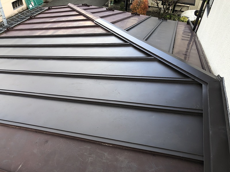 縦葺きの長尺タイプですと、立平葺きというタイプもあり、瓦棒葺きより安価で防水性が高い商品もあります。瓦棒葺き→立平葺きへの葺き替えが多くなってきています。シンプルでスタイリッシュな屋根に仕上がります。