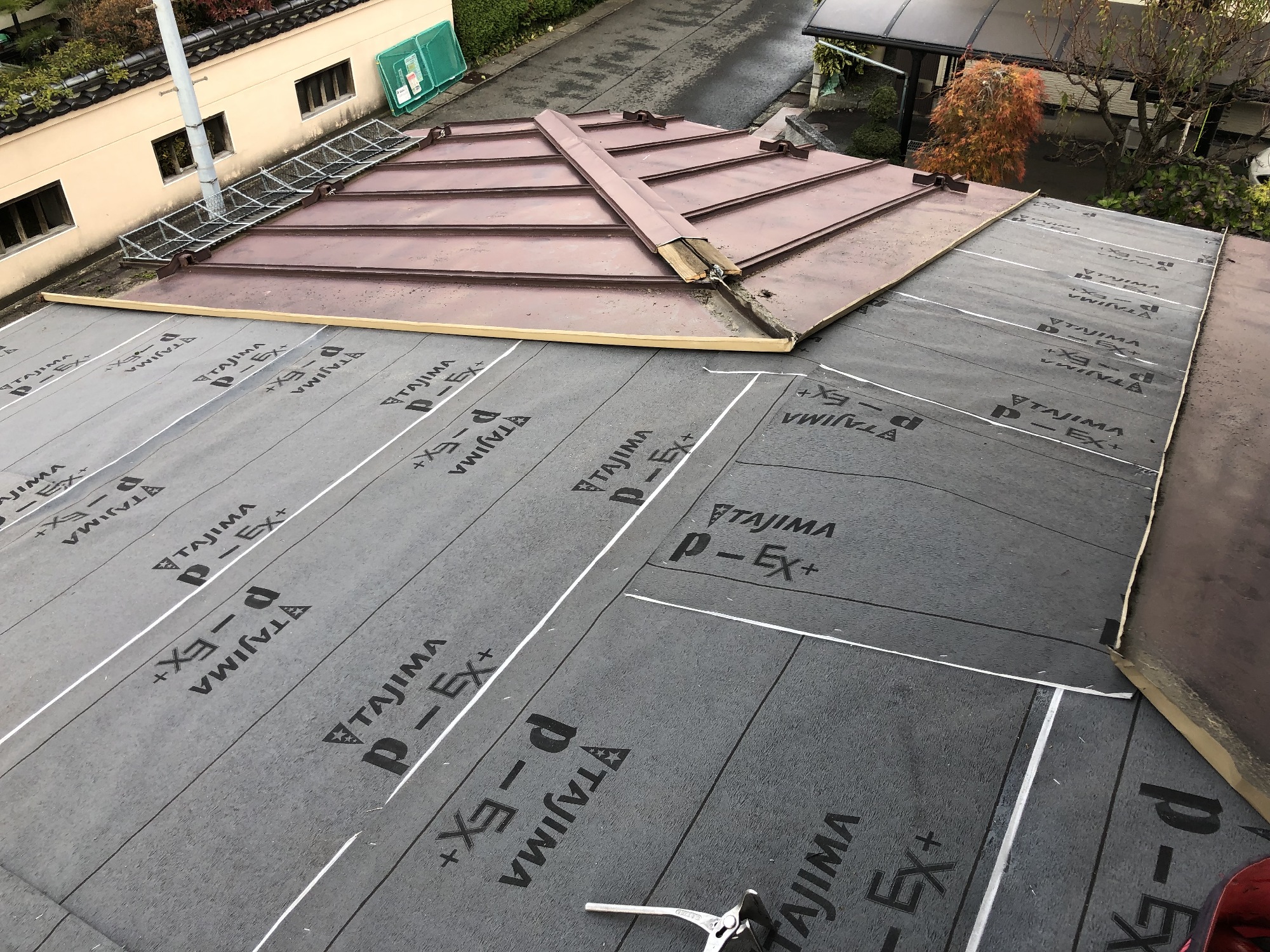 屋根には雪止め金具や雪止めネットを設置し、落雪による被害を防ぐとともに、寒冷地で発生する「スガ漏れ」と呼ばれる、寒冷地特有の雨漏り現象があります。二次防水の下葺き材(防水シート)の施工方法も重要です。当社の下葺き材は、改質アスファルトルーフィング(田島PカラーEX)を標準採用しております。防水性、耐久性に優れた下葺き材です。