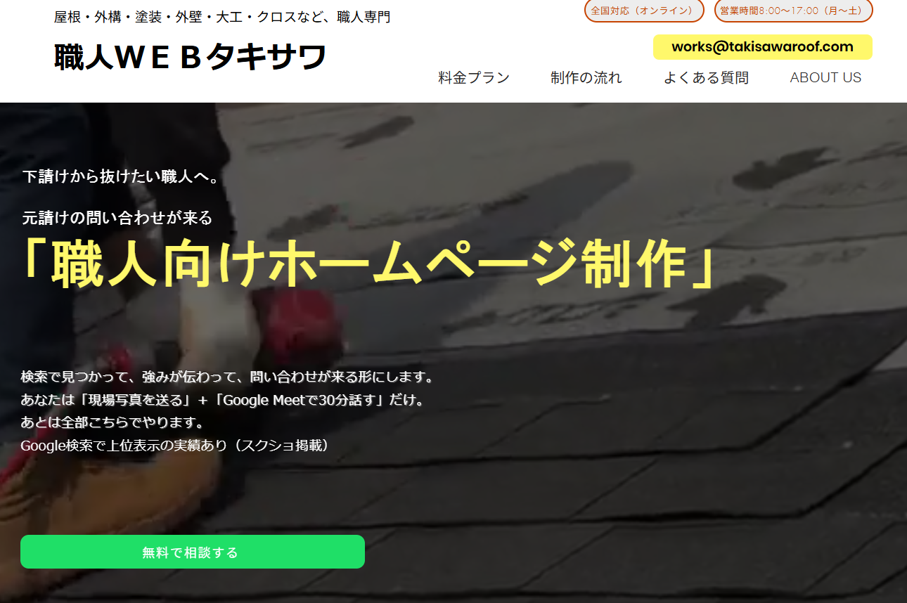 職人WEBタキサワは、職人向けホームページ制作に特化しています。