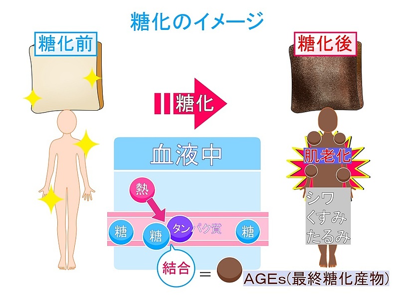 ※糖化とは「タンパク質」に「糖」が結合して体がコゲる事!、老化や美容だけではなく健康長寿にも深く関与しています。