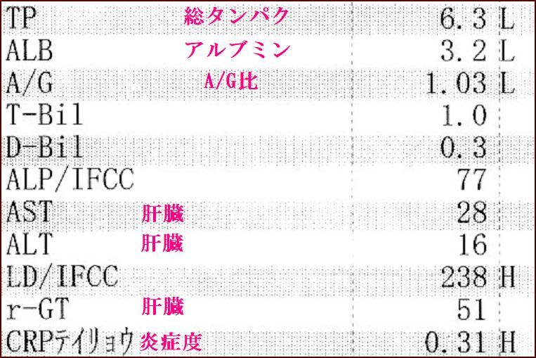 ★AST(GOT)・ALT(GPT)・γ-GTP値は基準値内なのに「総タンパク値」・「アルブミン値」・「A/G比値」は基準値以下=「タンパク質がたりないよ」の状態。