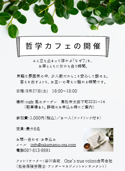 今秋は、岡山県主催の事業でも「哲学対話」のファシリテーターを担当させていただくことになりました。そのご縁に後押しされるように、地元・高松でも小さな哲学カフェを開いてみることにしました。