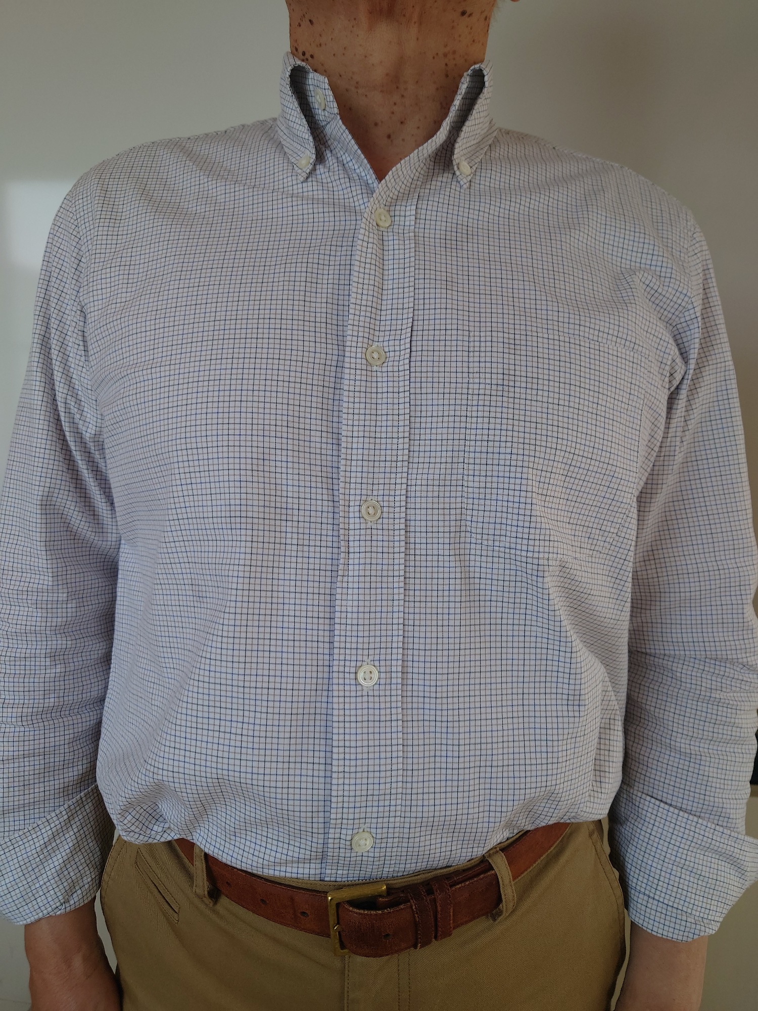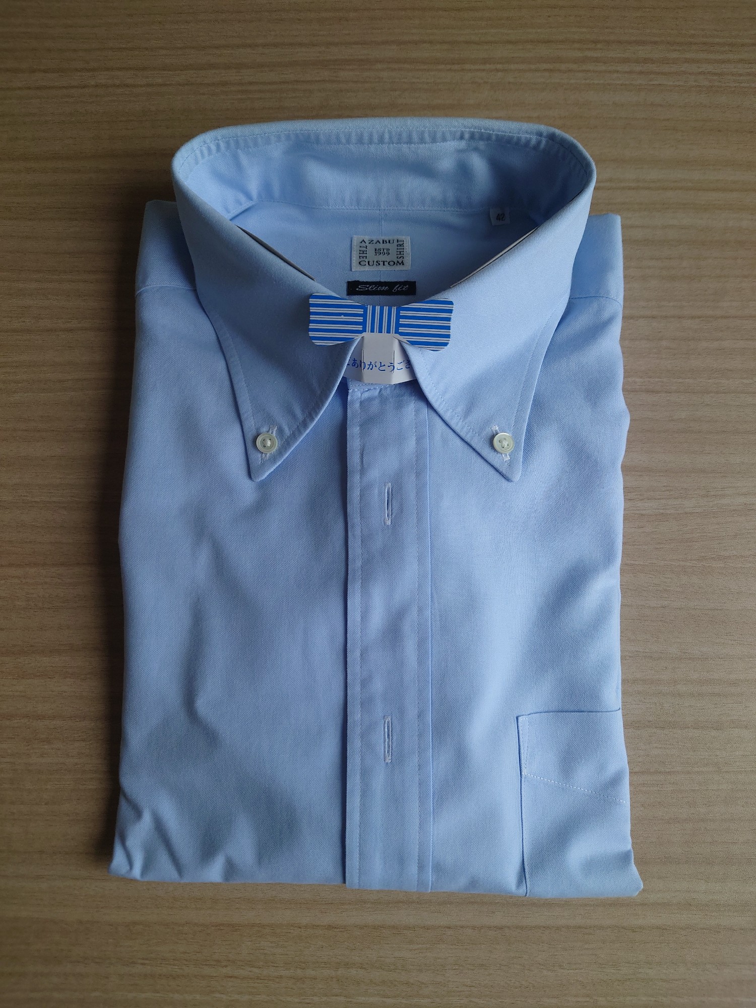 生地は、ブロードのような平織りのペラッとしたものではなくて、ロイヤルオックスフォードかピンポイントオックスフォードに限ります。これらの素材には少し厚みがあって、ちょっとだけスポーティーな感じが残っているところが好きな理由になります。ブルーの色合いも濃すぎず薄すぎず、鮮やかな青色が表現されていれば言うことはありません。
