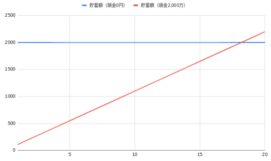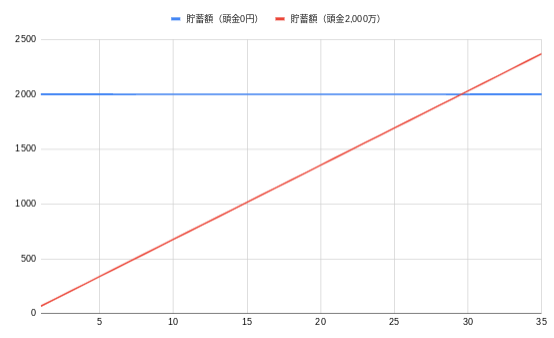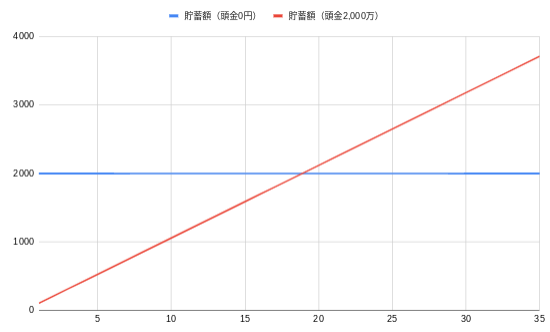 一方、頭金0万の場合は貯蓄が増えませんので2,000万のままです。