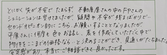 セカンドオピニオン的にこちら、お願いすることとなりましたが、平原さんに何度も色々お話し、表を作成していただく中で物件をここまでの価格なら・・と決めることができ、見通しがたちました。