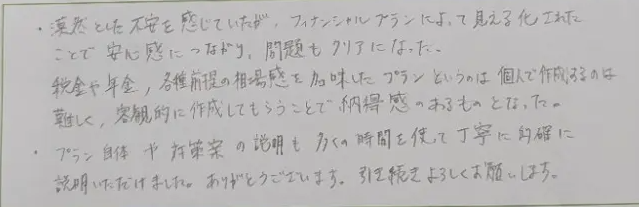 ・漠然とした不安を感じていたが、ファイナンシャルプランによって見える化されたことで安心感につながり、問題もクリアになった。