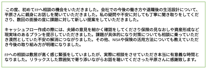 ·この度、初めてFPへ相談の機会をいただきました。会社での今後の働き方や退職後の生活設計について、平原さんに親身にお話しを聞いていただきました。私の疑問や不安に対しても丁寧に聞き取りをしてくださり、数回の面接の度に課題に対して新しい提案をしていただきました。