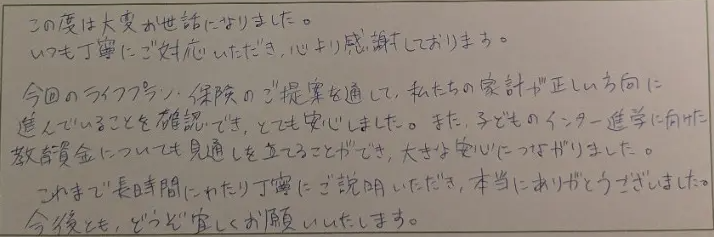 今回のライフプラン・保険のご提案を通して、私たちの家計が正しい方向に進んでいることを確認でき、とても安心しました。また、子どものインター進学に向けた教育資金についても見通しを立てることができ、大きな安心につながりました。