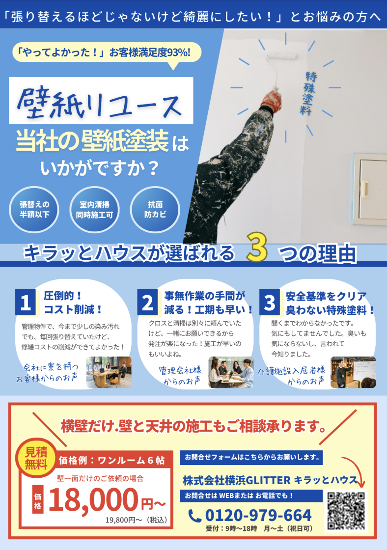 株式会社横浜GLITTER(グリッター)店舗名キラッとハウスの壁紙リユース工事をご紹介します。