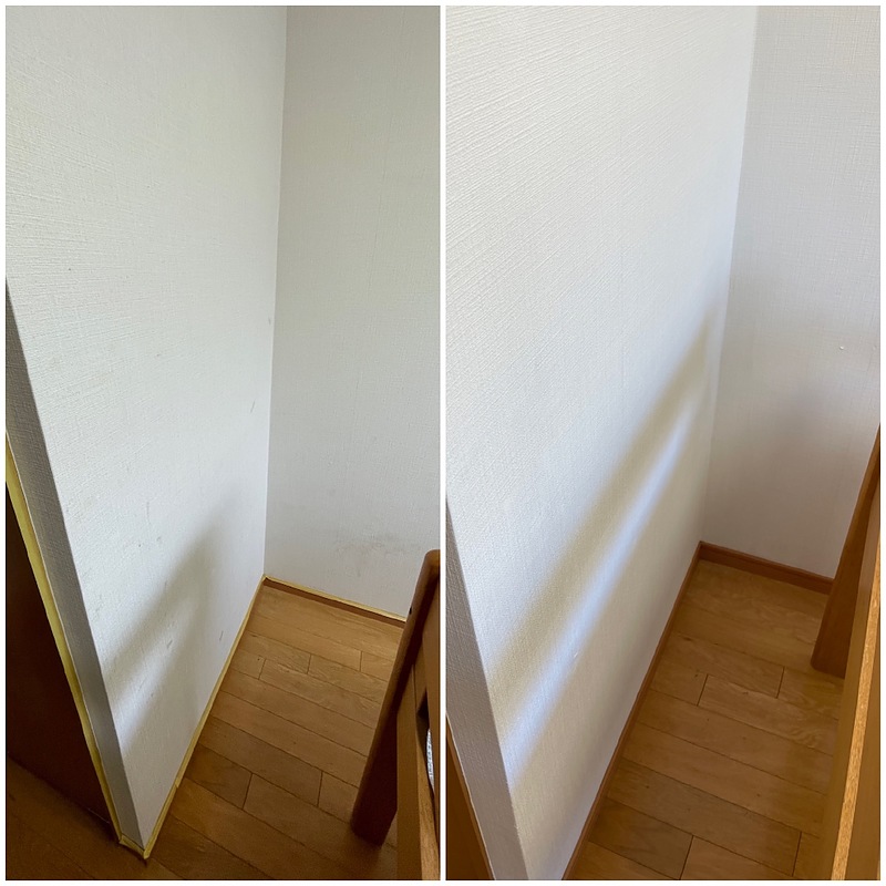 壁紙クリーニングは汚れや染みを落とす洗剤を使用して、その汚れだけを落としていきますが、新品同様には綺麗にならないことは多々あります。(強めの洗剤で洗浄漂白を行う手段もありますが…)壁紙リユースのクロス塗装は壁面の上から全体的に均一な色で着色していき自然な色味で美観を整えるので仕上がりが清掃とは全く違います。