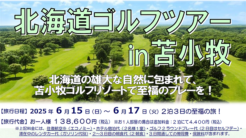 ※往復航空券(エコノミー)・2日間のゴルフプレー代・宿泊代(2食付)・滞在中のレンタカー代・2日間通しての帯同費・保険料を含む