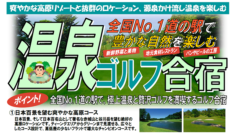 日本百景、そして日本百名山として著名な赤城山と谷川岳を一望する高原ゴルフ合宿です。道の駅グランプリ2025で3回目の1位に輝いた「川場田園プラザ」を観光し、白沢の恵み深い山麓から湧出する源泉掛け流し温泉「初穂美肌の湯」で疲れた体を癒していただきます。