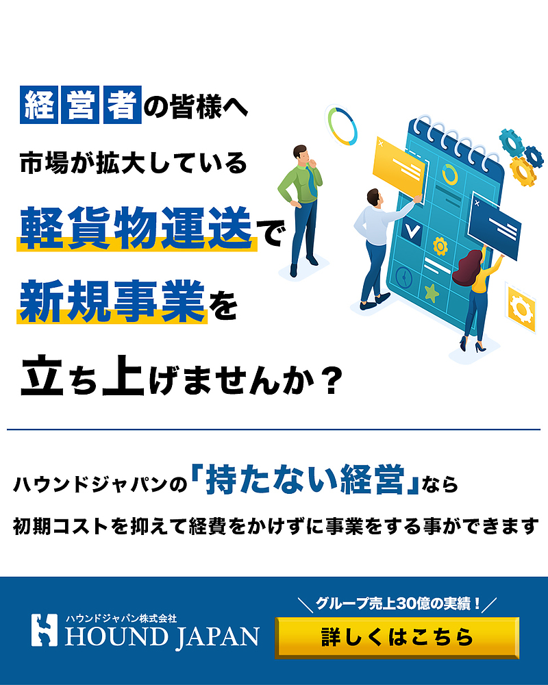 HOUND JAPAN株式会社は、軽貨物運送業界におけるリーダーとして、新規参入者の成功を全力で支援しています。低コストで始められる柔軟なビジネスモデルと充実したサポート体制により、事業の柱を手にすることが可能です。