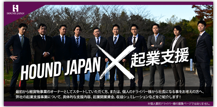 市場を見ると、ネット通販の普及に伴い、個人・法人共に軽貨物輸送の需要はますます高まっています。 こうした背景からも年々軽貨物で事業を立ち上げたいと考える方は増えております。『起業するなら、長く・太く・大きく続けて欲しい』という想いから、ハウンドジャパン株式会社ではドライバーの起業支援にも力を入れています。