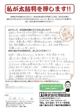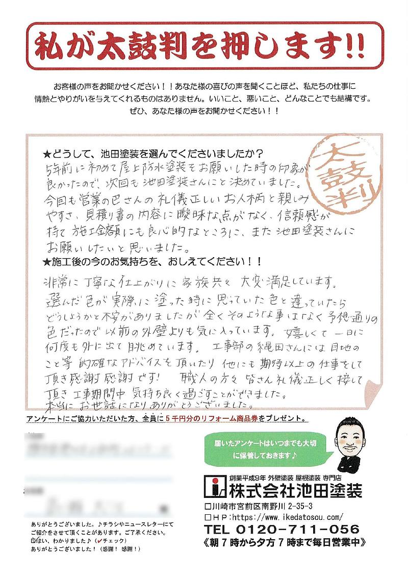 5年前に初めて屋上防水塗装をお願いした時の印象が良かったので、次回も池田塗装さんにと決めていました。今回も営業の巴さんの礼儀正しいお人柄と親しみやすさ、見積り書の内容に曖昧な点がなく、信頼感が持て施工金額にも良心的なところに、また池田塗装さんにお願いしたいと思いました。