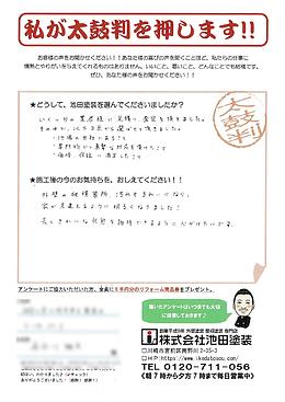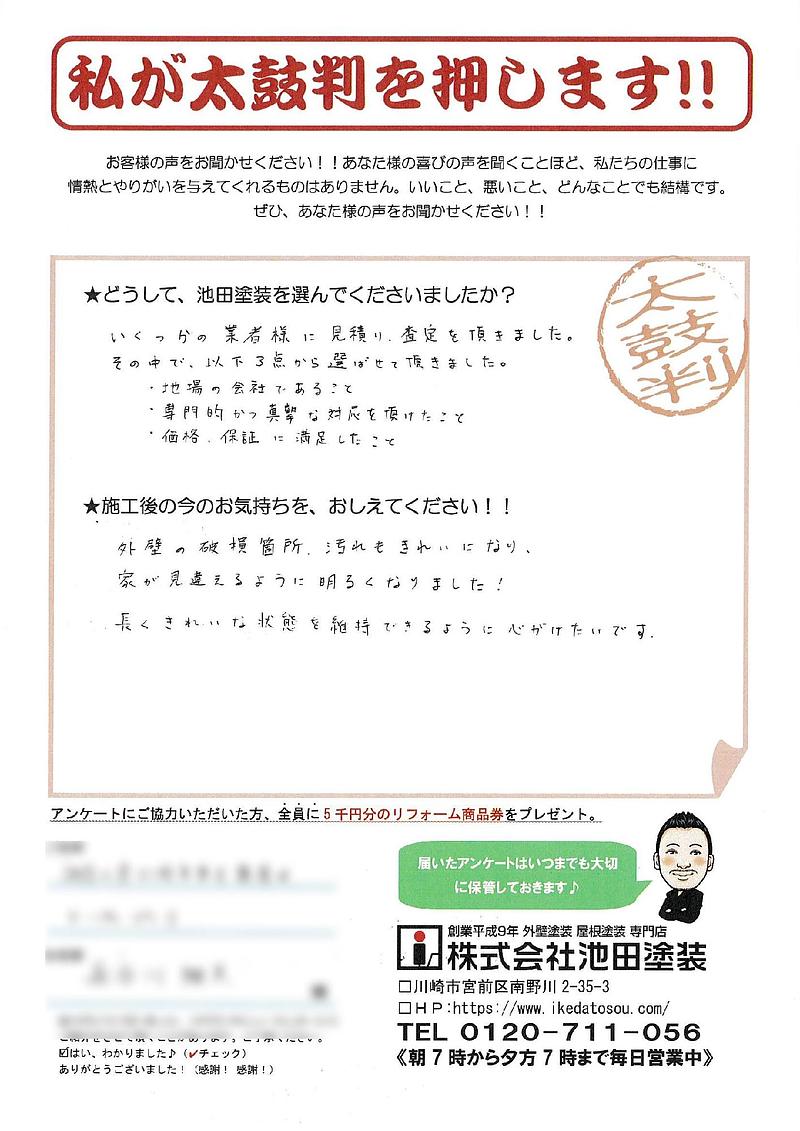 ★どうして、池田塗装を選んでくださいましたか?いくつかの業者に見積り、査定を頂きました。その中で、以下3点から選ばせて頂きました。・地場の会社であること・専門的かつ真摯な対応頂けたこと・価格・保証に満足したこと★施工後の今のお気持ちを、おしえてください!!外壁の破損個所、汚れもきれいになり家が見違えるように明るくなりました。長くきれいな状態を維持できるように心がけたいです。