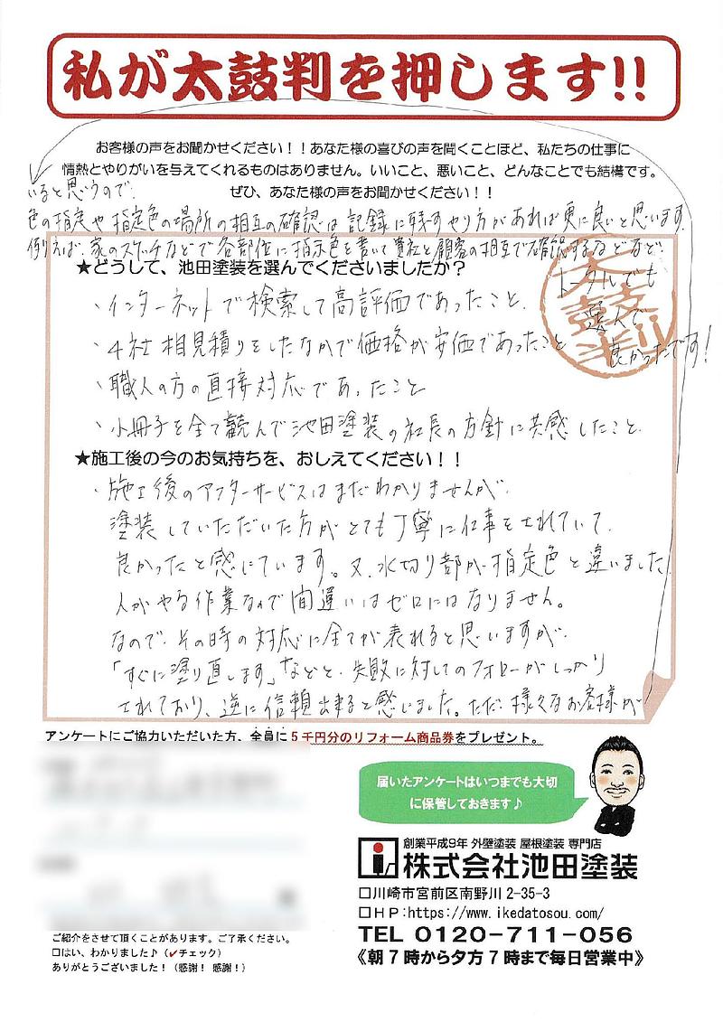 ★どうして、池田塗装を選んでくださいましたか?・インターネットで検索して高評価であったこと・4社相見積りをしたなかで価格が安価であったこと・職人の方の直接対応であったこと・小冊子を全て読んで池田塗装の社長の方針に共感したこと★施工後の今のお気持ちを、おしえてください!!・施工後のアフターサービスはまだわかりませんが、塗装していただいた方がとても丁寧に仕事をされていて良かったと感じています。又、水切り部が指定した色と違いました人がやる作業なので間違いはゼロにはなりません。なので、その時の対応にすべてが表れると思いますが「すぐに塗り直します」などと、失敗に対してのフォローがしっかりされており、逆に信頼できると感じました。ただ様々なお客様がいると思うので、白の指定や指定職の場所の相互の確認は記録に残すやり方があれば更に良いと思います例えば、家のスケッチなどで各部位に指定色を書いて貴社と顧客の相互で確認するなどなどトータルでも選ひとで良かったです!